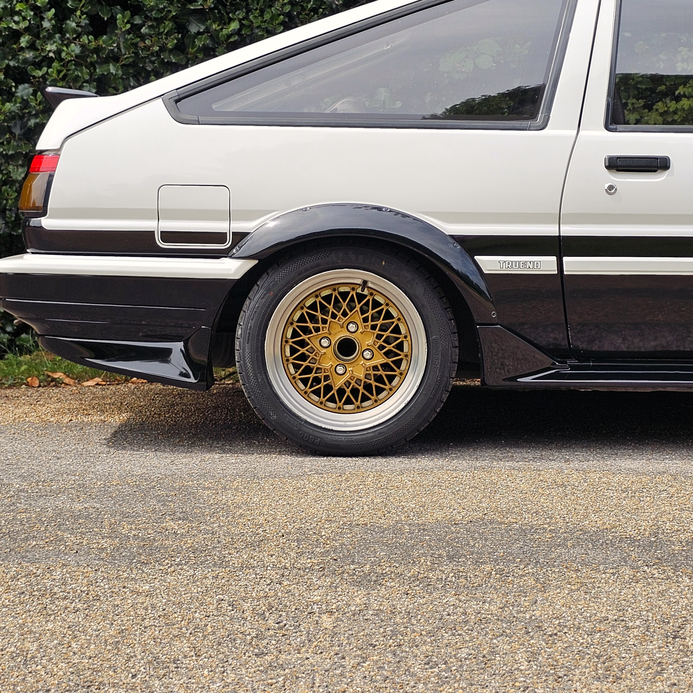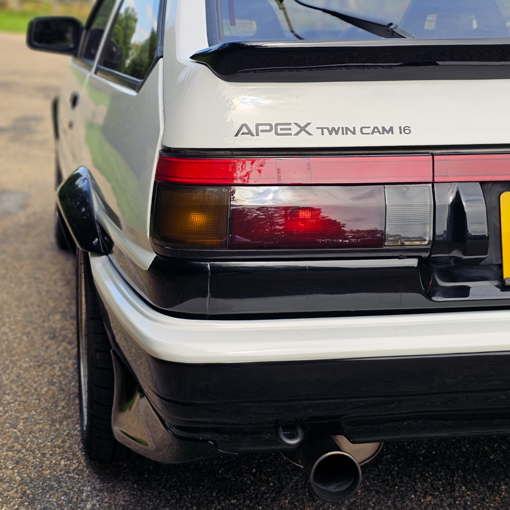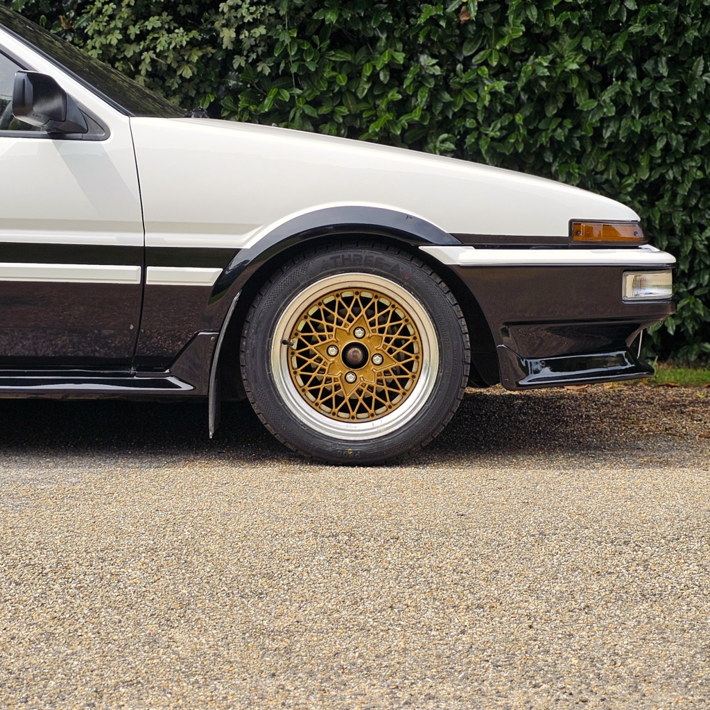 MCN Sport arches/splitter, Run Free spats, OEM sideskirts, Redline rear lights, 15″ Racing Mesh wheels – tasteful upgrades whilst still retaining that 86 charm.
